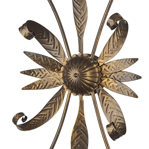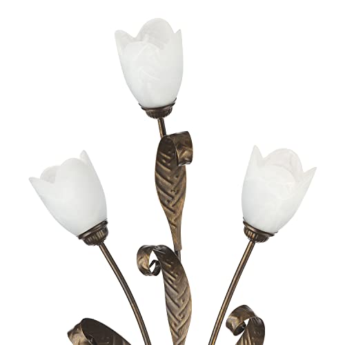 La struttura è in metallo color marrone spennellato oro, mentre il paralume, a forma di calla, è in vetro opaco con decoro alabastro bianco e bordi smerlati