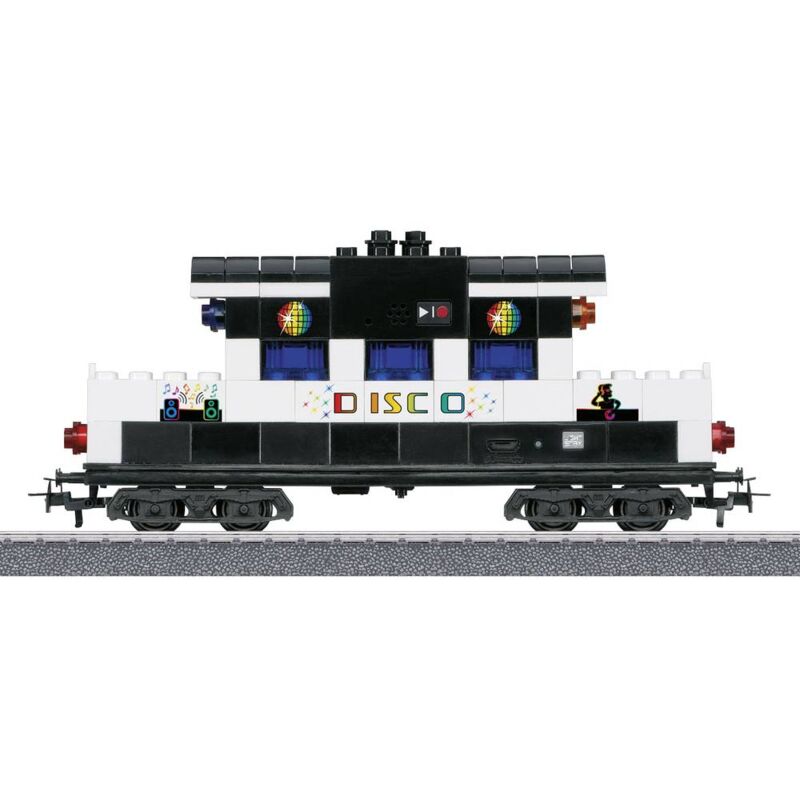 Dettagli tecnici Classe di età da 15 anni Dimensione di costruzione H0 Modello (modellismo ferroviario) Vagone speciale Sistema di corrente AC H0 Vagone da discoteca con moduli di luce e suoni Vagone a quattro assi come vagone con il montaggio di un disco auto. Il vagone è dotato di perni comuni, che invitano a creare una costruzione con mattoncini. Per la realizzazione del vagone l'articolo comprende un kit per un disco vagoni. Il kit di montaggio contiene mattoncini per la struttura vagone, le Mobile Power per la funzioni di luce, un modulo audio per l'audio e adesivi per l'etichettatura fittizia dei vagoni. Per i moduli sono moduli luce, il singolo dettagli del carrello per portate. I moduli sono compatibile con moduli di altri produttori. L'audio è dotato di un tasto Play & Record, con dell'audio può essere registrati e riprodotti (registrazione e riproduzione). Lunghezza audio fino a 60 secondi, che è in loop continuo può essere riprodotta. L'unità Mobile Power dispone di 6