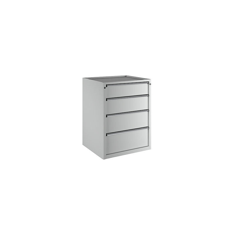 Cassettiera, largh. x prof. 760 x 675 mm, portata cassetti 200 kg, 4 cassetti, altezza 980 mm, frontalino grigio chiaro. Fornitura = montato. Altezza = 980 mm. Larghezza = 760 mm. Profondità = 675 mm. Portata per cassetto = 200 kg. Numero cassetti = 4 pz. Altezza cassetti = 1x180, 1x210, 1x240, 1x270 mm. Estrazione cassetti = 100%. Colore corpo = grigio chiaro RAL 7035. Colore frontalino = grigio chiaro RAL 7035. Dotazione = sicure antiribaltamento. Materiale = lamiera d'acciaio, verniciata a polvere. Versione cassetti = guida a rulli. Serratura = chiusura centralizzata a cilindro. Dimensioni interne cassetti = 600x600 mm. Caratteristiche = possibilità di applicare targhette. Portata cassetti 200 kg. Estraibili al 100%, massimo sfruttamento dello spazio. Sicurezza antiribaltamento garantita da un fermo di bloccaggio singolo. Chiusura centralizzata: serratura a cilindro con nucleo sostituibile o serratura elettronica. Robusta struttura in lamiera d'acciaio verniciata a polvere. Corpo
