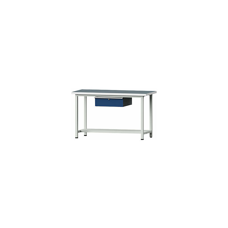 Banco da lavoro, struttura modulare, 1 cassetto, 1 ripiano, larghezza 1500 mm, altezza 890 mm, piano universale. Fornitura = montato. Larghezza piano = 1500 mm. Profondità piano = 700 mm. Tipo di piano = piano con rivestimento universale. Spessore piano = 40 mm. Numero cassetti = 1 pz. Altezza cassetti = 1x170 mm. Altezza = 890 mm. Altezza di lavoro = 890 mm. Colore frontalino = blu genziana RAL 5010. Versione cassetti = guida a rulli. Portata per cassetto = 50 kg. Estrazione cassetti = 86%. Materiale telaio = acciaio, verniciato a polvere. Portata statica = 800 kg. Versione telaio = tubo a sezione quadra 45x45 mm. Colore telaio = grigio chiaro RAL 7035. Serratura = chiusura centralizzata a cilindro con nucleo sostituibile. Numero ripiani = 1 pz. Larghezza x profondità 1500 x 700 mm. Maniglia in alluminio con targhette. Massima stabilità - componenti del corpo ribattuti fino a 10 volte. Resistente piano di lavoro in listelli di faggio a incastri incollati (estremamente robusto e