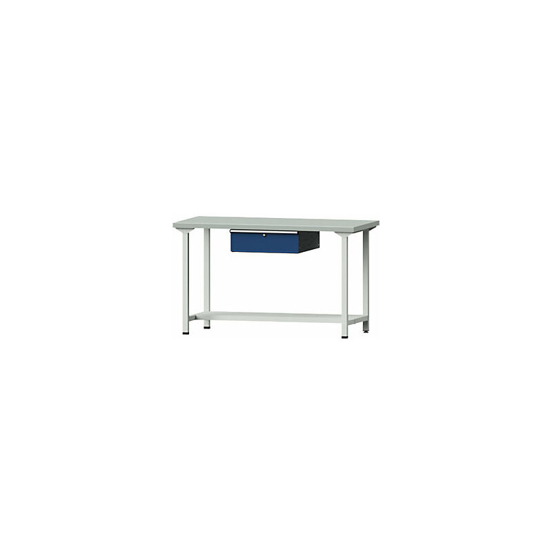 Banco da lavoro, struttura modulare, 1 cassetto, 1 ripiano, larghezza 1500 mm, altezza 890 mm, piano rivestito in lamiera d'acciaio. Fornitura = montato. Larghezza piano = 1500 mm. Profondità piano = 700 mm. Tipo di piano = rivestimento in lamiera d'acciaio, zincata. Spessore piano = 40 mm. Numero cassetti = 1 pz. Altezza cassetti = 1x170 mm. Altezza = 890 mm. Altezza di lavoro = 890 mm. Colore frontalino = blu genziana RAL 5010. Versione cassetti = guida a rulli. Portata per cassetto = 50 kg. Estrazione cassetti = 86%. Materiale telaio = acciaio, verniciato a polvere. Portata statica = 800 kg. Versione telaio = tubo a sezione quadra 45x45 mm. Colore telaio = grigio chiaro RAL 7035. Serratura = chiusura centralizzata a cilindro con nucleo sostituibile. Numero ripiani = 1 pz. Larghezza x profondità 1500 x 700 mm. Maniglia in alluminio con targhette. Massima stabilità - componenti del corpo ribattuti fino a 10 volte. Resistente piano di lavoro in listelli di faggio a incastri incollati