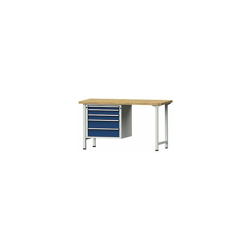 Banco da lavoro, struttura modulare, 5 cassetti, piano in faggio massello. Fornitura = montato. Larghezza piano = 1500 mm. Profondità piano = 700 mm. Tipo di piano = piano in faggio massello. Spessore piano = 40 mm. Numero cassetti = 5 pz. Altezza cassetti = 1x60, 2x90, 2x150 mm. Altezza = 840 mm. Altezza di lavoro = 840 mm. Colore frontalino = blu genziana RAL 5010. Versione cassetti = guida a rulli. Portata per cassetto = 100 kg. Estrazione cassetti = 100%. Larghezza cassetti = 500 mm. Profondità cassetti = 540 mm. Materiale telaio = acciaio, verniciato a polvere. Portata statica = 800 kg. Versione telaio = tubo a sezione quadra 45x45 mm. Colore telaio = grigio chiaro RAL 7035. Serratura = chiusura centralizzata a cilindro con nucleo sostituibile. Massima stabilità - componenti del corpo ribattuti fino a 10 volte. Resistente piano di lavoro in listelli di faggio a incastri incollati (estremamente robusto e resistente a deformazioni) o con rivestimento universale o rivestimento in