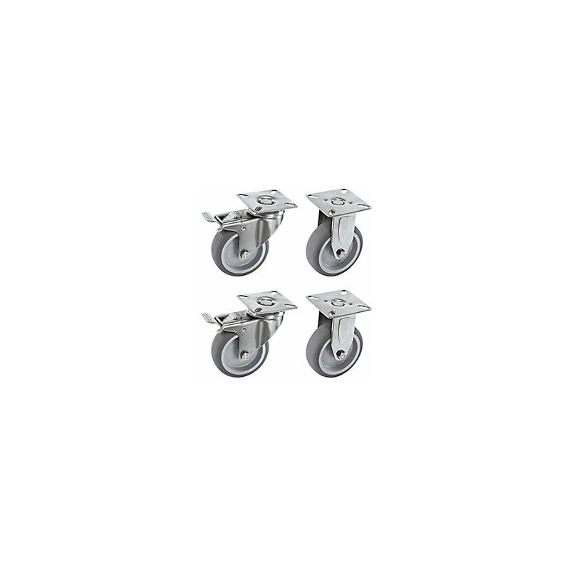 Set di ruote in gomma termoplastica, supporto in acciaio inox, piastra di montaggio, 2 rotelle pivottanti con fermo, 2 rotelle a supporto fisso, Ø x larghezza ruote 75 x 23 mm. Fornitura = montato. Diametro ruote = 75 mm. Forma = rotella pivottante con fermo doppio, rotella a supporto fisso. Fornitura = 2 rotelle pivottanti con fermo doppio e 2 rotelle a supporto fisso. Materiale ruote = gomma - elastomeri in gomma termoplastica (TPE). Materiale cerchioni = polipropilene. Materiale corpo = acciaio inox. Portata a 4 km/h = 75 kg. Tipo di fissaggio = con piastra di fissaggio. Larghezza ruote = 23 mm. Altezza d'ingombro = 100 mm. Cuscinetti ruota = cuscinetto a strisciamento. Resistenza alle temperature = da -10 °C fino a +70 °C. Sporgenza rotelle pivottanti = 32 mm. Diametro fori filettati = 6 mm. Dimensioni piastra rotella a supporto fisso mm = 60x60 mm. Dimensioni piastra rotella pivottante = 60x60 mm. Interasse fori filettati = 38x38 - 46x46 mm. Superficie del corpo = acciaio inox.