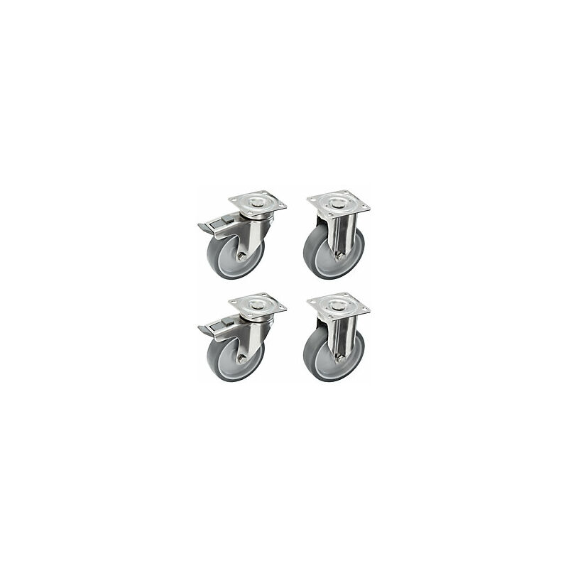 Set di ruote in gomma termoplastica, supporto in acciaio inox, piastra di montaggio, 2 rotelle pivottanti con fermo, 2 rotelle a supporto fisso, Ø x larghezza ruote 125 x 32 mm. Fornitura = montato. Diametro ruote = 125 mm. Forma = rotella pivottante con fermo doppio, rotella a supporto fisso. Fornitura = 2 rotelle pivottanti con fermo doppio e 2 rotelle a supporto fisso. Materiale ruote = gomma - elastomeri in gomma termoplastica (TPE). Materiale cerchioni = polipropilene. Materiale corpo = acciaio inox. Portata a 4 km/h = 100 kg. Tipo di fissaggio = con piastra di fissaggio. Larghezza ruote = 32 mm. Altezza d'ingombro = 159 mm. Cuscinetti ruota = cuscinetto a strisciamento. Resistenza alle temperature = da -10 °C fino a +70 °C. Sporgenza rotelle pivottanti = 35 mm. Diametro fori filettati = 8.3 mm. Dimensioni piastra rotella a supporto fisso mm = 76x70 mm. Dimensioni piastra rotella pivottante = 76x70 mm. Interasse fori filettati = 60x50 mm. Superficie del corpo = acciaio inox.
