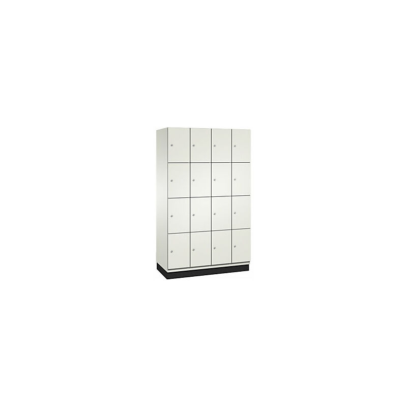 Armadietto a scomparti CAMBIO con porte HPL, 16 scomparti, corpo bianco puro / anta bianca, larghezza 1200 mm. Fornitura = montato. Altezza = 1950 mm. Profondità = 525 mm. Larghezza = 1200 mm. Colore corpo = bianco puro RAL 9010. Colore porta = bianco. Serratura = serratura a cilindro differenziata. Numero scomparti in larghezza = 4 pz. Numero scomparti = 16 pz. Larghezza scomparti = 300 mm. Materiale = lamiera d'acciaio. Altezza armadietto = 1950 mm. Dotazione interna = senza dotazione interna. Larghezza interna = 262 mm. Altezza interna = 412 mm. Profondità interna = 480 mm. Tipo di porta = pannello con anima piena HPL. Numero chiavi = 2 pz. Altezza scomparti = 462.5 mm. Larghezza ripiani = 300 mm. Profondità ripiani = 525 mm. Altezza zoccolo = 100 mm. Struttura = con saldatura. Superficie = verniciatura. Struttura in acciaio di lunga durata con ante a battente in HPL simil-legno. Cerniere in acciaio inox. Finecorsa di apertura a 90°. Corpo in materiale zincato. Zoccolino regolabile