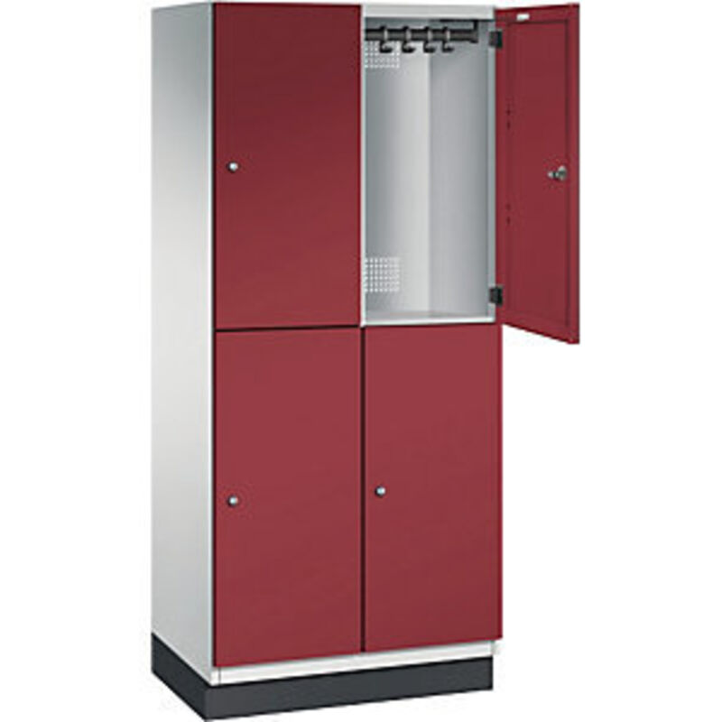 Armadio a scomparti CAMBIO con asta appendiabiti, 4 scomparti, corpo grigio chiaro / anta rosso rubino, larghezza 800 mm. Fornitura = montato. Altezza = 1950 mm. Profondità = 525 mm. Larghezza = 800 mm. Colore corpo = grigio chiaro RAL 7035. Colore porta = rosso rubino RAL 3003. Serratura = serratura a cilindro differenziata. Numero scomparti in larghezza = 2 pz. Numero scomparti = 4 pz. Larghezza scomparti = 400 mm. Materiale = lamiera d'acciaio. Altezza armadietto = 1950 mm. Dotazione interna = 1 asta appendiabiti, 4 ganci scorrevoli. Larghezza interna = 362 mm. Altezza interna = 862 mm. Profondità interna = 480 mm. Tipo di porta = anta a battente in acciaio. Numero chiavi = 2 pz. Altezza scomparti = 925 mm. Larghezza ripiani = 400 mm. Profondità ripiani = 525 mm. Altezza zoccolo = 100 mm. Struttura = con saldatura. Superficie = verniciatura. Struttura in acciaio di lunga durata con ante a battente. Cerniere in acciaio inox. Finecorsa di apertura a 90°. Corpo in materiale zincato.