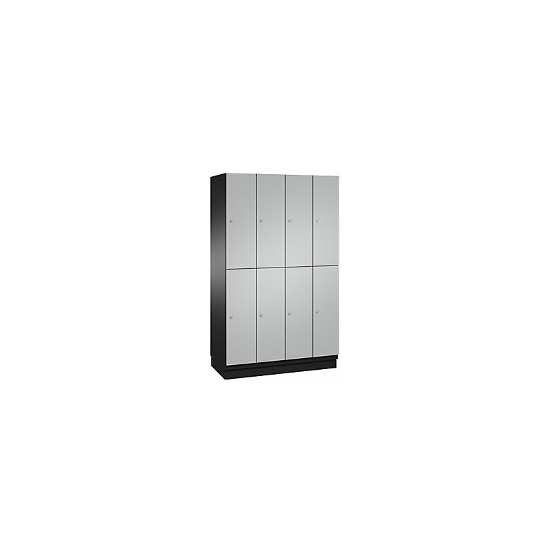 Armadio a scomparti CAMBIO con asta appendiabiti, 8 scomparti, corpo grigio nerastro / anta alluminio brillante. Fornitura = montato. Altezza = 1950 mm. Profondità = 525 mm. Larghezza = 1200 mm. Colore corpo = grigio nerastro RAL 7021. Colore porta = alluminio brillante RAL 9006. Serratura = serratura a cilindro differenziata. Numero scomparti in larghezza = 4 pz. Numero scomparti = 8 pz. Larghezza scomparti = 300 mm. Materiale = lamiera d'acciaio. Altezza armadietto = 1950 mm. Dotazione interna = 1 asta appendiabiti, 4 ganci scorrevoli. Larghezza interna = 262 mm. Altezza interna = 862 mm. Profondità interna = 480 mm. Tipo di porta = anta a battente in acciaio. Numero chiavi = 2 pz. Altezza scomparti = 925 mm. Larghezza ripiani = 300 mm. Profondità ripiani = 525 mm. Altezza zoccolo = 100 mm. Struttura = con saldatura. Superficie = verniciatura. Struttura in acciaio di lunga durata con ante a battente. Cerniere in acciaio inox. Finecorsa di apertura a 90°. Corpo in materiale zincato.