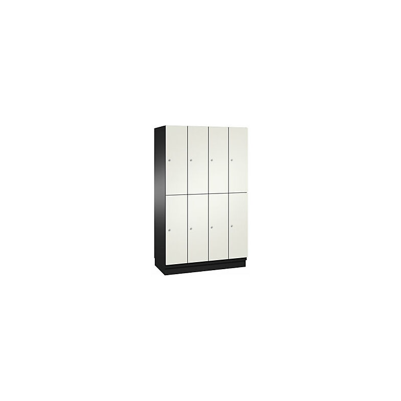 Armadio a scomparti CAMBIO con asta appendiabiti, 8 scomparti, corpo grigio nerastro / anta bianco puro. Fornitura = montato. Altezza = 1950 mm. Profondità = 525 mm. Larghezza = 1200 mm. Colore corpo = grigio nerastro RAL 7021. Colore porta = bianco puro RAL 9010. Serratura = serratura a cilindro differenziata. Numero scomparti in larghezza = 4 pz. Numero scomparti = 8 pz. Larghezza scomparti = 300 mm. Materiale = lamiera d'acciaio. Altezza armadietto = 1950 mm. Dotazione interna = 1 asta appendiabiti, 4 ganci scorrevoli. Larghezza interna = 262 mm. Altezza interna = 862 mm. Profondità interna = 480 mm. Tipo di porta = anta a battente in acciaio. Numero chiavi = 2 pz. Altezza scomparti = 925 mm. Larghezza ripiani = 300 mm. Profondità ripiani = 525 mm. Altezza zoccolo = 100 mm. Struttura = con saldatura. Superficie = verniciatura. Struttura in acciaio di lunga durata con ante a battente. Cerniere in acciaio inox. Finecorsa di apertura a 90°. Corpo in materiale zincato. Robusta asta
