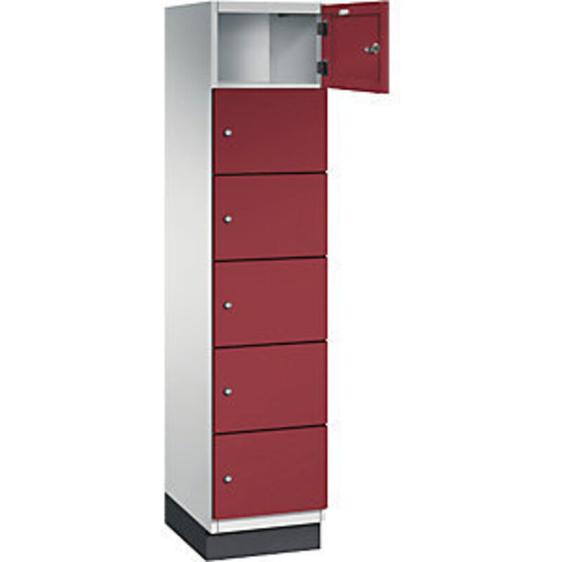 Armadietto a scomparti CAMBIO con porte in lamiera d'acciaio, 6 scomparti larghi 400 mm, corpo grigio chiaro / anta rosso rubino. Fornitura = montato. Altezza = 1950 mm. Profondità = 525 mm. Larghezza = 400 mm. Colore corpo = grigio chiaro RAL 7035. Colore porta = rosso rubino RAL 3003. Serratura = serratura a cilindro differenziata. Numero scomparti in larghezza = 1 pz. Numero scomparti = 6 pz. Larghezza scomparti = 400 mm. Materiale = lamiera d'acciaio. Altezza armadietto = 1950 mm. Dotazione interna = senza dotazione interna. Larghezza interna = 362 mm. Altezza interna = 262 mm. Profondità interna = 480 mm. Tipo di porta = anta in lamiera piena. Numero chiavi = 2 pz. Altezza scomparti = 308.3 mm. Larghezza ripiani = 400 mm. Profondità ripiani = 525 mm. Altezza zoccolo = 100 mm. Struttura = con saldatura. Superficie = verniciatura. Struttura in acciaio di lunga durata con ante a battente in acciaio. Cerniere in alluminio/plastica. Finecorsa di apertura a 90°. Materiale corpo e anta