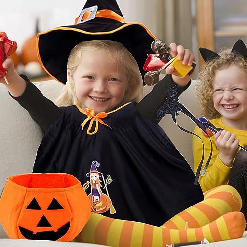 【Costume di Halloween per Ragazza】: Otterrai 1 mantello halloween bambini + 1 cappello da mago + 1 bacchetta magica + 1 sacchetto zucca. La dimensione del mantello è di 80 x 110 cm, adatta a bambini alti 90-150 cm. È un regalo popolare per i bambini di Halloween e i bambini lo adoreranno.