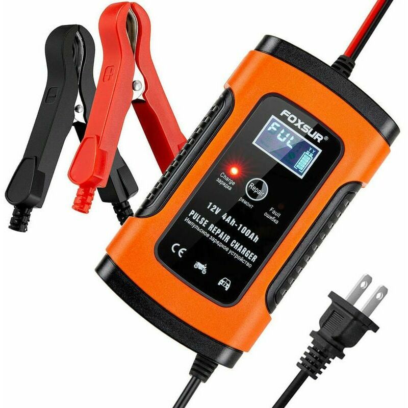 FOXSUR 12V UPS Caricabatterie per auto moto Caricabatteria per riparazione impulsi con display LCD. • Controllo tramite microprocessore (CPU). • 3 fasi di ricarica automatiche: • Tecnologia di commutazione: sì • Protezione contro la polarità: sì • Protezione contro i cortocircuiti in uscita: sì • Protezione del collegamento senza batteria: sì • Protezione da sovratensione: sì • Protezione da surriscaldamento: sì • Ventola< /p> • Tensione di ingresso: 100-240 VAC, 50-60 Hz • Uscita nominale: 12 VDC, 5-6 A max. • Tensione minima di avviamento: 8,0 V • Autonomia della batteria: 4 -100 Ah • Protezione termica: 65;