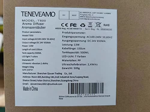 【500ML Serbatoio d'acqua】: il serbatoio dell'acqua è di 500 ml, Il diffusore di oli essenziali contiene BPA-Free.
