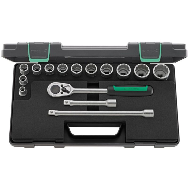 255 1 Cricchetto: n. art. 640100 Conservazione in: Astuccio di plastica ABS Dati tecnici Altezza mm 64 Imballaggio Astuccio di plastica ABS Larghezza mm 226 Lunghezza mm 413 Tipo di prodotto Chiave a bussola Campo apertura bussola poligonale, mm 10-32 Quadro di manovra femmina, Zoll 1/2 Profilo di manovra Chiave a bussola poligonale Dimensione apertura Metrica Numero pezzi 15
