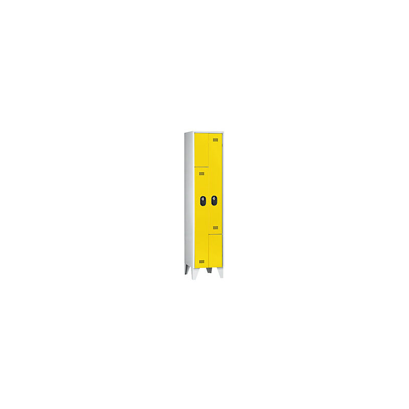 Armadietto guardaroba, altezza scomparto 820 mm, alt. x largh. x prof. 1850 x 400 x 500 mm, larghezza scomparto 400 mm, colore corpo / ante: grigio chiaro / giallo zinco. Fornitura = montato. Altezza = 1850 mm. Profondità = 500 mm. Larghezza = 400 mm. Colore corpo = grigio chiaro RAL 7035. Colore porta = giallo zinco RAL 1018. Serratura = chiavistello girevole di sicurezza per lucchetto. Numero scomparti in larghezza = 1 pz. Numero scomparti = 2 pz. Larghezza scomparti = 200 / 400 mm. Materiale = lamiera d'acciaio, saldata a punti. Altezza armadietto = 820 / 390 mm. Dotazione interna = 1 asta appendiabiti, 2 ganci, 1 ripiano. Larghezza interna = 200 / 400 mm. Altezza interna = 820 / 390 mm. Profondità interna = 475 mm. Tipo di porta = anta a battente. Altezza piedini = 150 mm. Struttura = saldata. Superficie = con verniciatura a forno. Scomparto con ripiano a tutta lunghezza (adatto per caschi da moto). Foratura di aerazione sull'anta. Struttura in lamiera d'acciaio verniciata a fuoco.