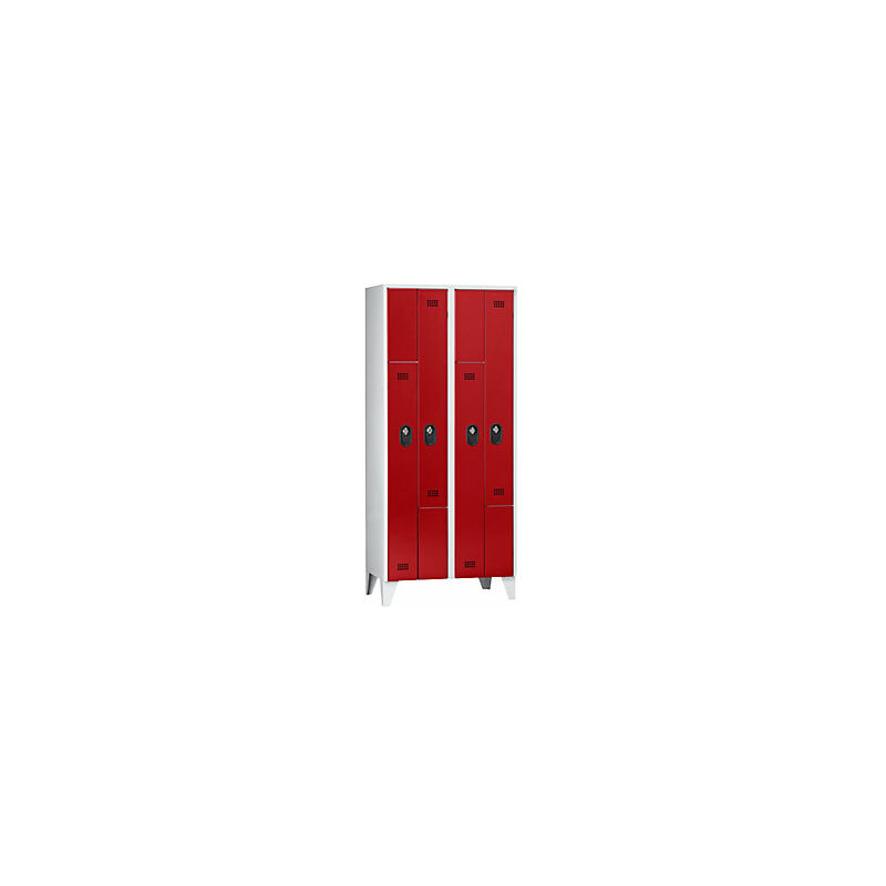 Armadietto guardaroba, altezza scomparto 820 mm, alt. x largh. x prof. 1850 x 800 x 500 mm, larghezza scomparto 400 mm, colore corpo / ante: grigio chiaro / rosso fuoco. Fornitura = montato. Altezza = 1850 mm. Profondità = 500 mm. Larghezza = 800 mm. Colore corpo = grigio chiaro RAL 7035. Colore porta = rosso fuoco RAL 3000. Serratura = chiavistello girevole di sicurezza per lucchetto. Numero scomparti in larghezza = 2 pz. Numero scomparti = 4 pz. Larghezza scomparti = 200 / 400 mm. Materiale = lamiera d'acciaio, saldata a punti. Altezza armadietto = 820 / 390 mm. Dotazione interna = 1 asta appendiabiti, 2 ganci, 1 ripiano. Larghezza interna = 200 / 400 mm. Altezza interna = 820 / 390 mm. Profondità interna = 475 mm. Tipo di porta = anta a battente. Altezza piedini = 150 mm. Struttura = saldata. Superficie = con verniciatura a forno. Scomparto con ripiano a tutta lunghezza (adatto per caschi da moto). Foratura di aerazione sull'anta. Struttura in lamiera d'acciaio verniciata a fuoco.