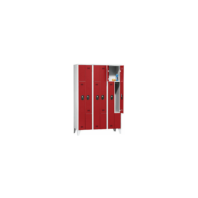 Armadietto guardaroba, altezza scomparto 820 mm, alt. x largh. x prof. 1850 x 1200 x 500 mm, larghezza scomparto 400 mm, colore corpo / ante: grigio chiaro / rosso fuoco. Fornitura = montato. Altezza = 1850 mm. Profondità = 500 mm. Larghezza = 1200 mm. Colore corpo = grigio chiaro RAL 7035. Colore porta = rosso fuoco RAL 3000. Serratura = chiavistello girevole di sicurezza per lucchetto. Numero scomparti in larghezza = 3 pz. Numero scomparti = 6 pz. Larghezza scomparti = 200 / 400 mm. Materiale = lamiera d'acciaio, saldata a punti. Altezza armadietto = 820 / 390 mm. Dotazione interna = 1 asta appendiabiti, 2 ganci, 1 ripiano. Larghezza interna = 200 / 400 mm. Altezza interna = 820 / 390 mm. Profondità interna = 475 mm. Tipo di porta = anta a battente. Altezza piedini = 150 mm. Struttura = saldata. Superficie = con verniciatura a forno. Scomparto con ripiano a tutta lunghezza (adatto per caschi da moto). Foratura di aerazione sull'anta. Struttura in lamiera d'acciaio verniciata a fuoco.
