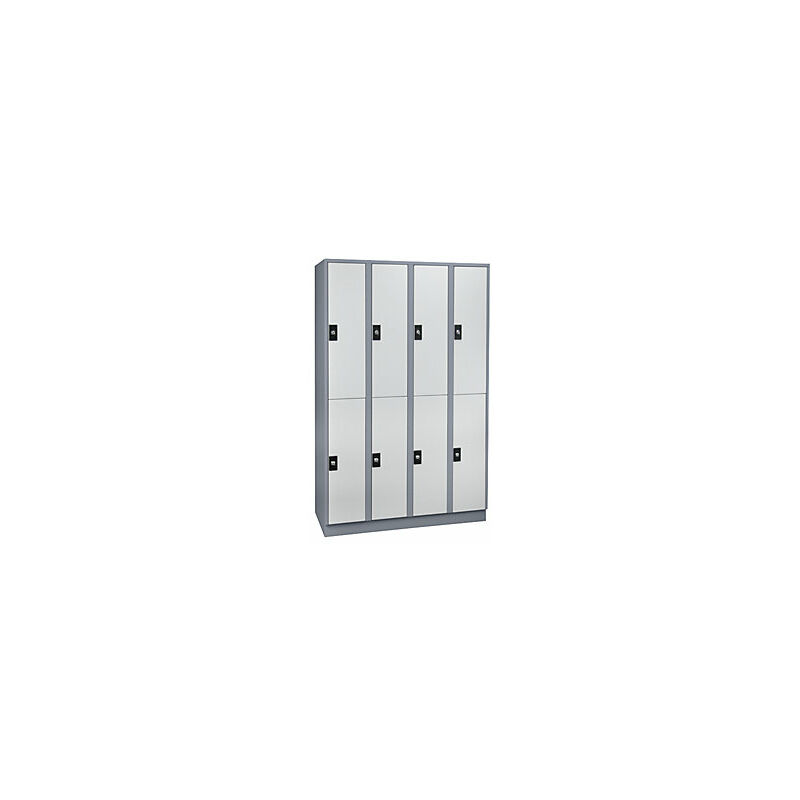 Armadietto guardaroba, 8 scomparti, larghezza 1200 mm, grigio argento / grigio chiaro. Fornitura = montato. Altezza = 1800 mm. Profondità = 500 mm. Larghezza = 1200 mm. Colore corpo = grigio argento RAL 7001. Colore porta = grigio chiaro RAL 7035. Serratura = serratura a cilindro di sicurezza differenziata. Numero scomparti in larghezza = 4 pz. Numero scomparti = 8 pz. Larghezza scomparti = 300 mm. Materiale = lamiera d'acciaio. Altezza armadietto = 1800 mm. Dotazione interna = 1 asta appendiabiti, 3 ganci. Larghezza interna = 298 mm. Altezza interna = 820 mm. Profondità interna = 475 mm. Tipo di porta = frontalini lisci. Numero chiavi = 2 pz. Altezza scomparti = 820 mm. Larghezza ripiani = 300 mm. Profondità ripiani = 500 mm. Altezza zoccolo = 100 mm. Struttura = saldata. Superficie = con verniciatura a forno. Scomparti interni senza bordi per una facile pulizia. Aerazione mediante fori sulla parete posteriore. Fermi in gomma per una battuta ante silenziosa. Resistente struttura in