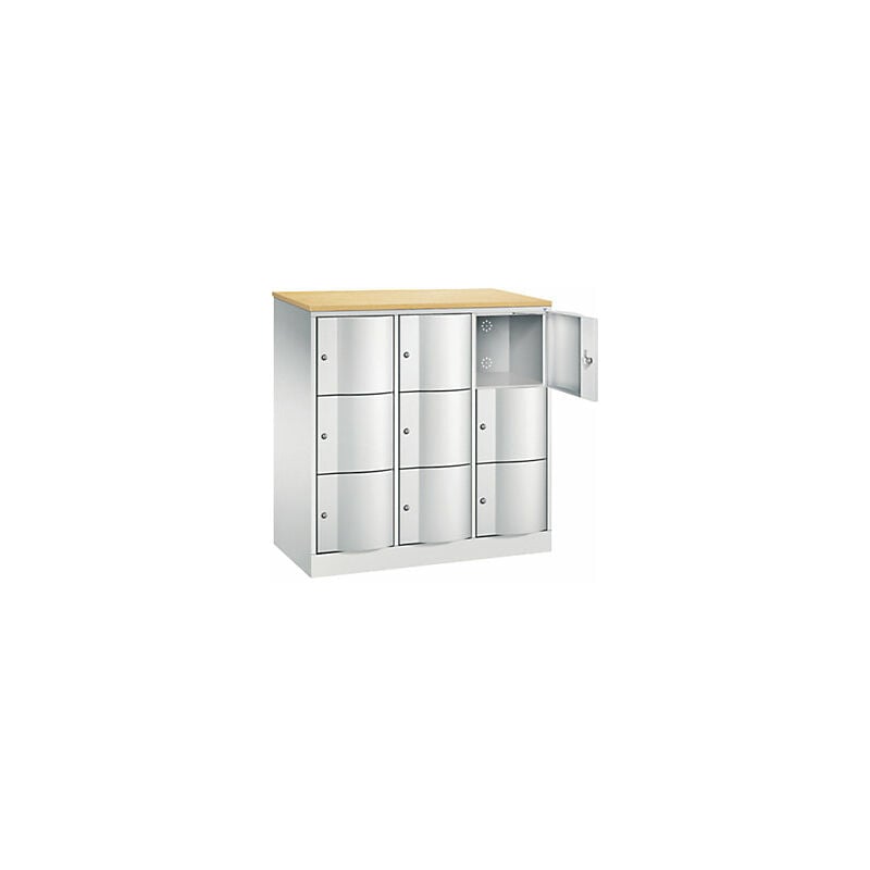 Armadietto a scomparti RESISTO, alt. x largh. x prof. 1255 x 1150 x 540, 9 scomparti, grigio chiaro RAL 7035 / grigio chiaro RAL 7035. Fornitura = montato. Altezza = 1255 mm. Profondità = 540 mm. Larghezza = 1150 mm. Colore corpo = grigio chiaro RAL 7035. Colore porta = grigio chiaro RAL 7035. Serratura = serratura a cilindro differenziata. Numero scomparti in larghezza = 3 pz. Numero scomparti = 9 pz. Larghezza scomparti = 380 mm. Materiale = acciaio. Altezza armadietto = 1255 mm. Dotazione interna = senza dotazione interna. Larghezza interna = 320 mm. Altezza interna = 336 mm. Profondità interna = 460 mm. Tipo di porta = anta a battente. Numero chiavi = 2 pz. Profondità ripiani = 540 mm. Altezza zoccolo = 100 mm. Struttura = saldata. Superficie = con verniciatura a forno. Finecorsa di apertura a 80°. Ante in lamiera d'acciaio di 1,5 mm, arcuate, sicure contro gli atti di vandalismo. Aerazione mediante fori sulla parete posteriore. Robusta struttura d'acciaio con verniciatura a forno