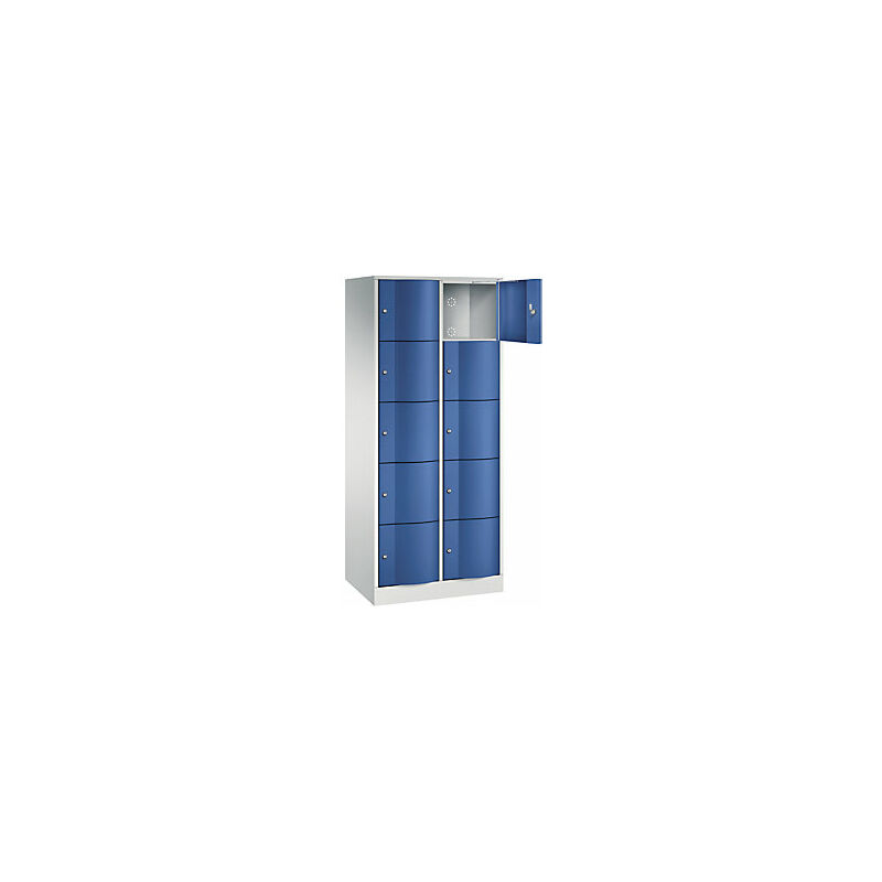 Armadietto a scomparti RESISTO, alt. x largh. x prof. 1950 x 770 x 540, 10 scomparti, grigio chiaro RAL 7035 / blu genziana RAL 5010. Fornitura = montato. Altezza = 1950 mm. Profondità = 540 mm. Larghezza = 770 mm. Colore corpo = grigio chiaro RAL 7035. Colore porta = blu genziana RAL 5010. Serratura = serratura a cilindro differenziata. Numero scomparti in larghezza = 2 pz. Numero scomparti = 10 pz. Larghezza scomparti = 380 mm. Materiale = acciaio. Altezza armadietto = 1950 mm. Dotazione interna = senza dotazione interna. Larghezza interna = 320 mm. Altezza interna = 336 mm. Profondità interna = 460 mm. Tipo di porta = anta a battente. Numero chiavi = 2 pz. Profondità ripiani = 540 mm. Altezza zoccolo = 100 mm. Struttura = saldata. Superficie = con verniciatura a forno. Finecorsa di apertura a 80°. Ante in lamiera d'acciaio di 1,5 mm, arcuate, sicure contro gli atti di vandalismo. Aerazione mediante fori sulla parete posteriore. Robusta struttura d'acciaio con verniciatura a forno di