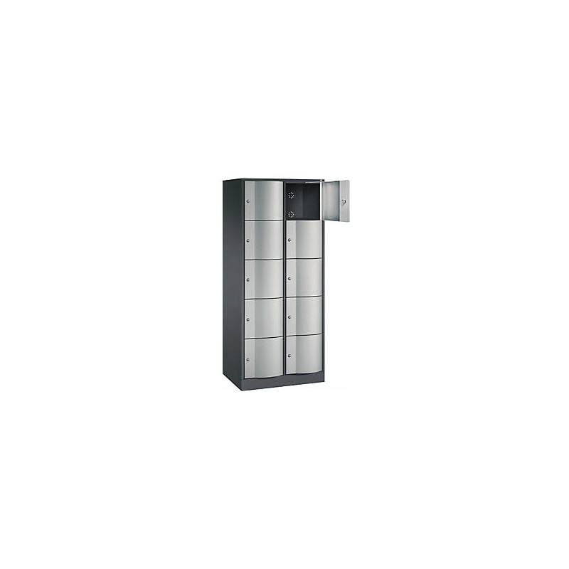 Armadietto a scomparti RESISTO, alt. x largh. x prof. 1950 x 770 x 540, 10 scomparti, grigio nerastro RAL 7021 / alluminio brillante RAL 9006. Fornitura = montato. Altezza = 1950 mm. Profondità = 540 mm. Larghezza = 770 mm. Colore corpo = grigio nerastro RAL 7021. Colore porta = alluminio brillante RAL 9006. Serratura = serratura a cilindro differenziata. Numero scomparti in larghezza = 2 pz. Numero scomparti = 10 pz. Larghezza scomparti = 380 mm. Materiale = acciaio. Altezza armadietto = 1950 mm. Dotazione interna = senza dotazione interna. Larghezza interna = 320 mm. Altezza interna = 336 mm. Profondità interna = 460 mm. Tipo di porta = anta a battente. Numero chiavi = 2 pz. Profondità ripiani = 540 mm. Altezza zoccolo = 100 mm. Struttura = saldata. Superficie = con verniciatura a forno. Finecorsa di apertura a 80°. Ante in lamiera d'acciaio di 1,5 mm, arcuate, sicure contro gli atti di vandalismo. Aerazione mediante fori sulla parete posteriore. Robusta struttura d'acciaio con