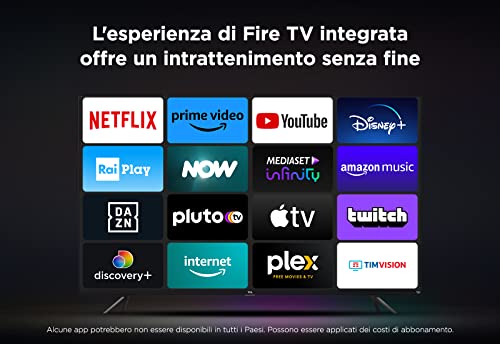 INTRATTENIMENTO ILLIMITATO: Grazie alla Fire TV integrata, potrai vivere un intrattenimento illimitato con migliaia di app e canali, inclusi Netflix, Prime Video, YouTube, Disney+, Raiplay, NOW e molti altri. (potrebbero essere applicati costi di abbonamento)
