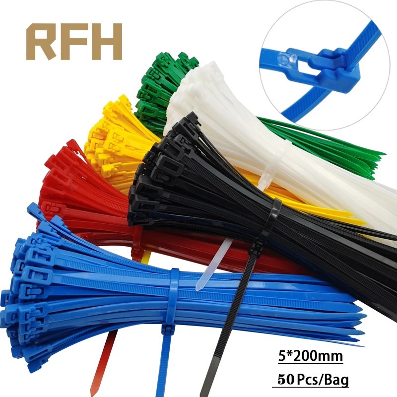 50PCS 5*200MM Releasable Cable Tie Colored Plastics Reusable Cable Ties Loop Wrap Nylon Zip Ties Bundle Ties