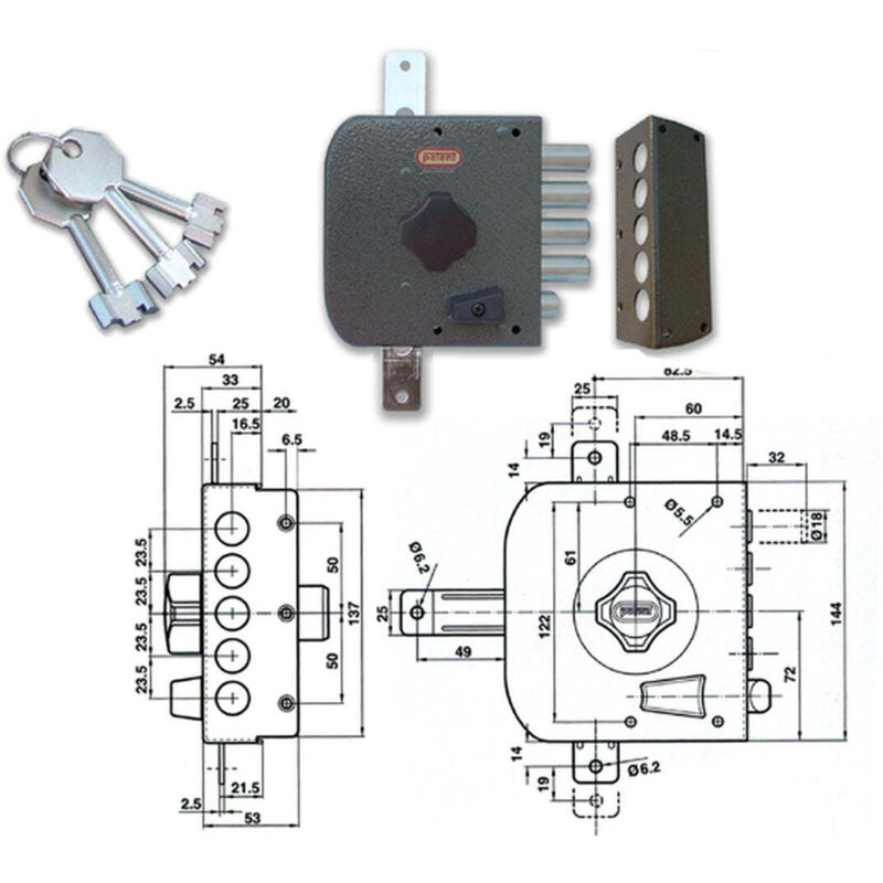 Potente 515 Tripla serratura da applicare, con scrocco, 4 scrocchi a cilindro a pompa, 3 chiavi fornite senza aste.