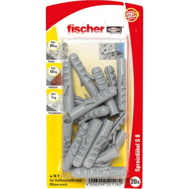 Materiali: Nylon, Plastica. Lunghezza dell''ancora/tassello: 4 cm, Diametro del buco: 8 mm, Profondità minima del foro del trapano: 5,5 cm. Quantità per pacco: 20 pezzo(i)