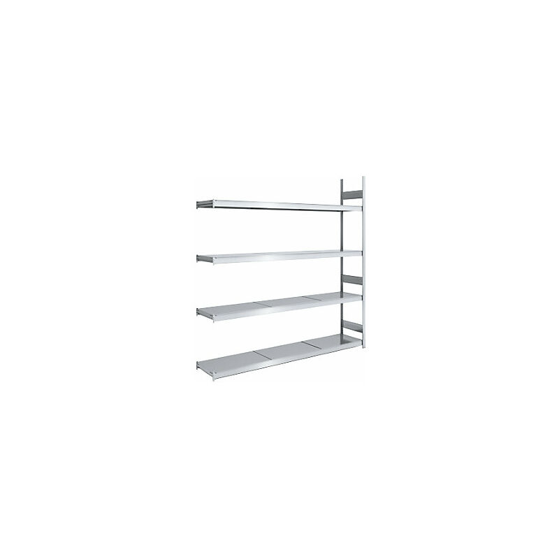 Scaffale a innesto a campata larga, zincato, largh. x prof. ripiano 2250 x 500 mm, scaffale aggiuntivo, 4 ripiani in acciaio, altezza 2500 mm. Fornitura = smontato. Altezza scaffale = 2500 mm. Tipo di scaffale = scaffale aggiuntivo. Materiale = acciaio, zincato. Larghezza totale = 2270 mm. Portata campata = 1750 kg. Portata ripiani = 350 kg. Profondità ripiani = 500 mm. Larghezza ripiani = 2250 mm. Numero ripiani = 4 pz. Tipo di prodotto = scaffali a innesto a campata larga.