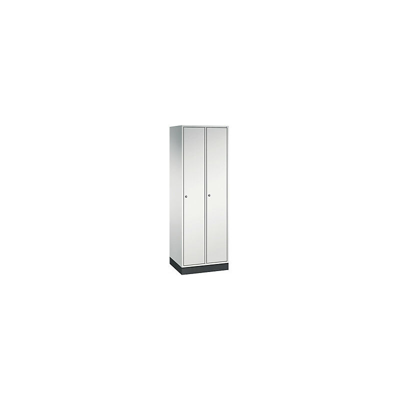 Armadietto guardaroba in acciaio INTRO, larghezza 620 mm, 2 scomparti, corpo grigio chiaro, ante grigio chiaro. Fornitura = montato. Altezza = 1950 mm. Profondità = 500 mm. Larghezza = 620 mm. Colore corpo = grigio chiaro RAL 7035. Colore porta = grigio chiaro RAL 7035. Serratura = serratura a cilindro differenziata. Numero scomparti in larghezza = 2 pz. Numero scomparti = 2 pz. Larghezza scomparti = 300 mm. Materiale = lamiera d'acciaio. Altezza armadietto = 1950 mm. Dotazione interna = 1 cappelliera, 1 asta appendiabiti con 3 ganci scorrevoli. Larghezza interna = 260 mm. Altezza interna = 1825 mm. Profondità interna = 460 mm. Tipo di porta = anta a battente. Numero chiavi = 2 pz. Altezza scomparti = 1825 mm. Larghezza ripiani = 300 mm. Profondità ripiani = 500 mm. Altezza zoccolo = 100 mm. Struttura = con saldatura. Superficie = verniciatura. Struttura in acciaio di lunga durata. Serratura a cilindro con 2 chiavi. Fori di aerazione sulla parete posteriore e distanziali da 20 mm.