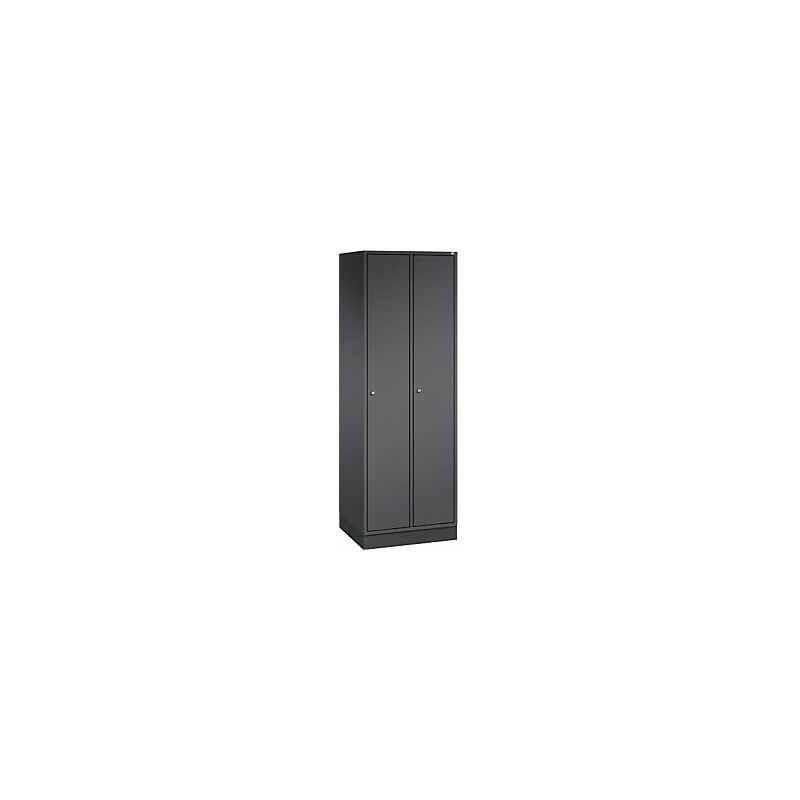 Armadietto guardaroba in acciaio INTRO, larghezza 620 mm, 2 scomparti, corpo grigio nerastro, ante grigio nerastro. Fornitura = montato. Altezza = 1950 mm. Profondità = 500 mm. Larghezza = 620 mm. Colore corpo = grigio nerastro RAL 7021. Colore porta = grigio nerastro RAL 7021. Serratura = serratura a cilindro differenziata. Numero scomparti in larghezza = 2 pz. Numero scomparti = 2 pz. Larghezza scomparti = 300 mm. Materiale = lamiera d'acciaio. Altezza armadietto = 1950 mm. Dotazione interna = 1 cappelliera, 1 asta appendiabiti con 3 ganci scorrevoli. Larghezza interna = 260 mm. Altezza interna = 1825 mm. Profondità interna = 460 mm. Tipo di porta = anta a battente. Numero chiavi = 2 pz. Altezza scomparti = 1825 mm. Larghezza ripiani = 300 mm. Profondità ripiani = 500 mm. Altezza zoccolo = 100 mm. Struttura = con saldatura. Superficie = verniciatura. Struttura in acciaio di lunga durata. Serratura a cilindro con 2 chiavi. Fori di aerazione sulla parete posteriore e distanziali da 20