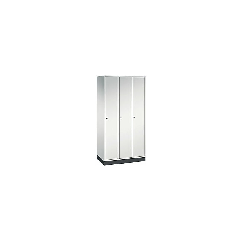 Armadietto guardaroba in acciaio INTRO, larghezza 920 mm, 3 scomparti, corpo grigio chiaro, ante grigio chiaro. Fornitura = montato. Altezza = 1950 mm. Profondità = 500 mm. Larghezza = 920 mm. Colore corpo = grigio chiaro RAL 7035. Colore porta = grigio chiaro RAL 7035. Serratura = serratura a cilindro differenziata. Numero scomparti in larghezza = 3 pz. Numero scomparti = 3 pz. Larghezza scomparti = 300 mm. Materiale = lamiera d'acciaio. Altezza armadietto = 1950 mm. Dotazione interna = 1 cappelliera, 1 asta appendiabiti con 3 ganci scorrevoli. Larghezza interna = 260 mm. Altezza interna = 1825 mm. Profondità interna = 460 mm. Tipo di porta = anta a battente. Numero chiavi = 2 pz. Altezza scomparti = 1825 mm. Larghezza ripiani = 300 mm. Profondità ripiani = 500 mm. Altezza zoccolo = 100 mm. Struttura = con saldatura. Superficie = verniciatura. Struttura in acciaio di lunga durata. Serratura a cilindro con 2 chiavi. Fori di aerazione sulla parete posteriore e distanziali da 20 mm.