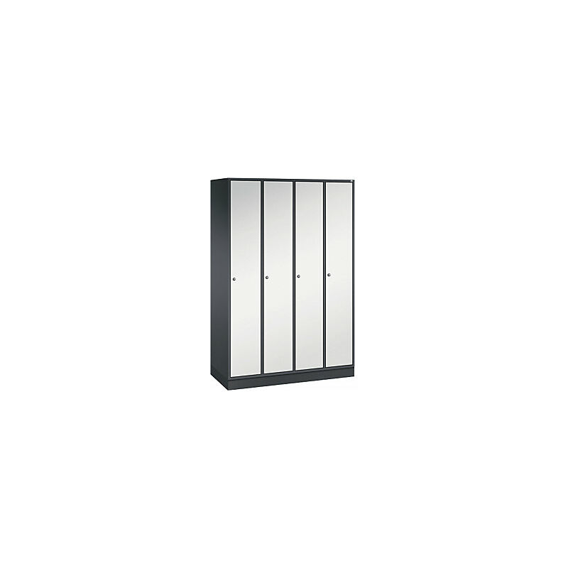Armadietto guardaroba in acciaio INTRO, larghezza 1220 mm, 4 scomparti, corpo grigio nerastro, ante grigio chiaro. Fornitura = montato. Altezza = 1950 mm. Profondità = 500 mm. Larghezza = 1220 mm. Colore corpo = grigio nerastro RAL 7021. Colore porta = grigio chiaro RAL 7035. Serratura = serratura a cilindro differenziata. Numero scomparti in larghezza = 4 pz. Numero scomparti = 4 pz. Larghezza scomparti = 300 mm. Materiale = lamiera d'acciaio. Altezza armadietto = 1950 mm. Dotazione interna = 1 cappelliera, 1 asta appendiabiti con 3 ganci scorrevoli. Larghezza interna = 260 mm. Altezza interna = 1825 mm. Profondità interna = 460 mm. Tipo di porta = anta a battente. Numero chiavi = 2 pz. Altezza scomparti = 1825 mm. Larghezza ripiani = 300 mm. Profondità ripiani = 500 mm. Altezza zoccolo = 100 mm. Struttura = con saldatura. Superficie = verniciatura. Struttura in acciaio di lunga durata. Serratura a cilindro con 2 chiavi. Fori di aerazione sulla parete posteriore e distanziali da 20