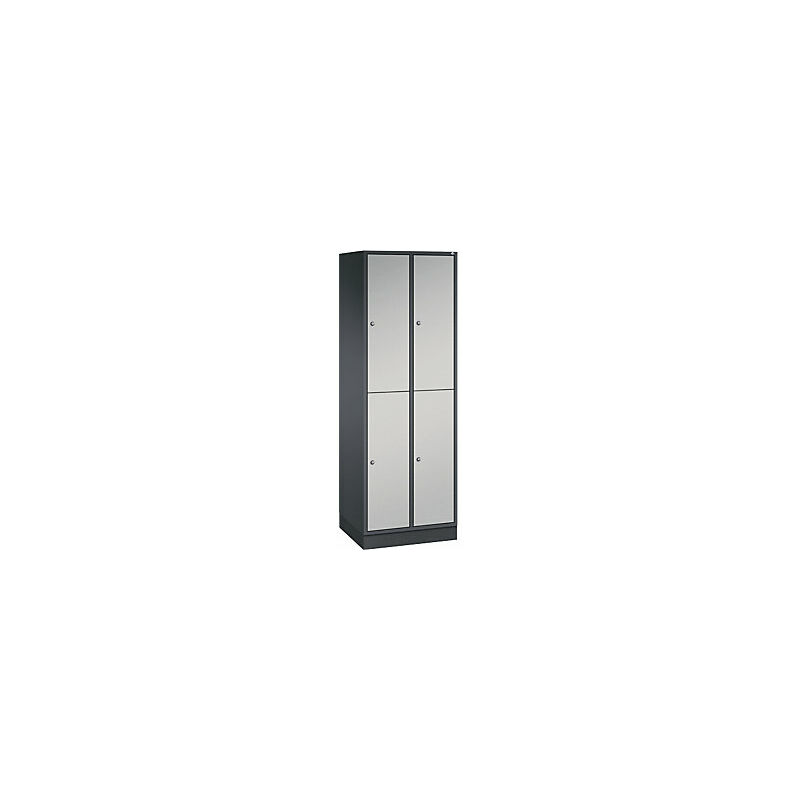 Armadietto guardaroba in acciaio INTRO sovrapposto a due posti, largh. x prof. 620 x 500 mm, 4 scomparti, corpo grigio nerastro, ante alluminio brillante. Fornitura = montato. Altezza = 1950 mm. Profondità = 500 mm. Larghezza = 620 mm. Colore corpo = grigio nerastro RAL 7021. Colore porta = alluminio brillante RAL 9006. Serratura = serratura a cilindro differenziata. Numero scomparti in larghezza = 2 pz. Numero scomparti = 4 pz. Larghezza scomparti = 300 mm. Materiale = lamiera d'acciaio. Altezza armadietto = 1950 mm. Dotazione interna = 1 asta appendiabiti, 3 ganci scorrevoli. Larghezza interna = 260 mm. Altezza interna = 895 mm. Profondità interna = 460 mm. Tipo di porta = anta a battente. Numero chiavi = 2 pz. Altezza scomparti = 895 mm. Larghezza ripiani = 260 mm. Profondità ripiani = 500 mm. Altezza zoccolo = 100 mm. Struttura = con saldatura. Superficie = con verniciatura a forno. Struttura in acciaio di lunga durata. Serratura a cilindro con 2 chiavi. Fori di aerazione sulla