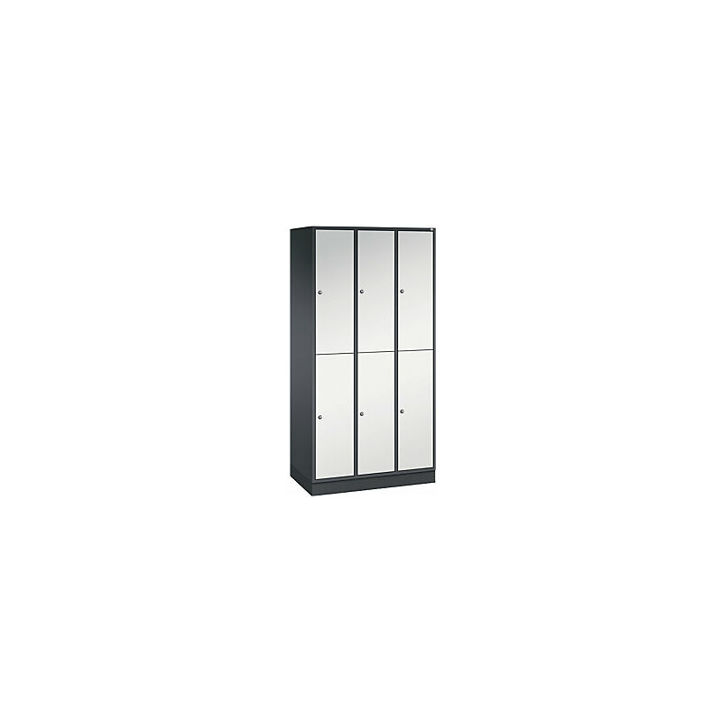 Armadietto guardaroba in acciaio INTRO sovrapposto a due posti, largh. x prof. 920 x 500 mm, 6 scomparti, corpo grigio nerastro, ante grigio chiaro. Fornitura = montato. Altezza = 1950 mm. Profondità = 500 mm. Larghezza = 920 mm. Colore corpo = grigio nerastro RAL 7021. Colore porta = grigio chiaro RAL 7035. Serratura = serratura a cilindro differenziata. Numero scomparti in larghezza = 3 pz. Numero scomparti = 6 pz. Larghezza scomparti = 300 mm. Materiale = lamiera d'acciaio. Altezza armadietto = 1950 mm. Dotazione interna = 1 asta appendiabiti, 3 ganci scorrevoli. Larghezza interna = 260 mm. Altezza interna = 895 mm. Profondità interna = 460 mm. Tipo di porta = anta a battente. Numero chiavi = 2 pz. Altezza scomparti = 895 mm. Larghezza ripiani = 260 mm. Profondità ripiani = 500 mm. Altezza zoccolo = 100 mm. Struttura = con saldatura. Superficie = con verniciatura a forno. Struttura in acciaio di lunga durata. Serratura a cilindro con 2 chiavi. Fori di aerazione sulla parete