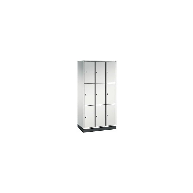 Armadietto a scomparti in acciaio INTRO, altezza scomparto 580 mm, largh. x prof. 920 x 500 mm, 9 scomparti, corpo grigio chiaro, ante grigio chiaro. Fornitura = montato. Altezza = 1950 mm. Profondità = 500 mm. Larghezza = 920 mm. Colore corpo = grigio chiaro RAL 7035. Colore porta = grigio chiaro RAL 7035. Serratura = serratura a cilindro differenziata. Numero scomparti in larghezza = 3 pz. Numero scomparti = 9 pz. Larghezza scomparti = 300 mm. Materiale = lamiera d'acciaio. Altezza armadietto = 1950 mm. Dotazione interna = senza dotazione interna. Larghezza interna = 260 mm. Altezza interna = 580 mm. Profondità interna = 460 mm. Tipo di porta = anta a battente. Numero chiavi = 2 pz. Altezza scomparti = 580 mm. Larghezza ripiani = 300 mm. Profondità ripiani = 500 mm. Altezza zoccolo = 100 mm. Struttura = con saldatura. Superficie = verniciatura. Struttura in acciaio di lunga durata. Serratura a cilindro con 2 chiavi. Fori di aerazione sulla parete posteriore e distanziali da 20 mm.