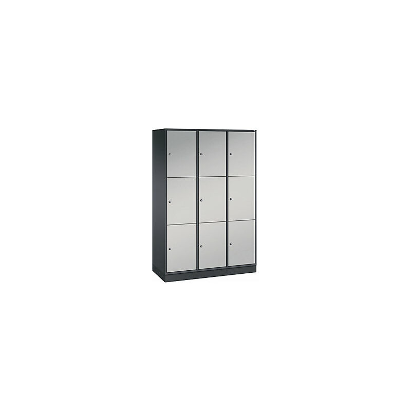 Armadietto a scomparti in acciaio INTRO, altezza scomparto 580 mm, largh. x prof. 1220 x 500 mm, 9 scomparti, corpo grigio nerastro, ante alluminio brillante. Fornitura = montato. Altezza = 1950 mm. Profondità = 500 mm. Larghezza = 1220 mm. Colore corpo = grigio nerastro RAL 7021. Colore porta = alluminio brillante RAL 9006. Serratura = serratura a cilindro differenziata. Numero scomparti in larghezza = 3 pz. Numero scomparti = 9 pz. Larghezza scomparti = 400 mm. Materiale = lamiera d'acciaio. Altezza armadietto = 1950 mm. Dotazione interna = senza dotazione interna. Larghezza interna = 360 mm. Altezza interna = 580 mm. Profondità interna = 460 mm. Tipo di porta = anta a battente. Numero chiavi = 2 pz. Altezza scomparti = 580 mm. Larghezza ripiani = 400 mm. Profondità ripiani = 500 mm. Altezza zoccolo = 100 mm. Struttura = con saldatura. Superficie = verniciatura. Struttura in acciaio di lunga durata. Serratura a cilindro con 2 chiavi. Fori di aerazione sulla parete posteriore e