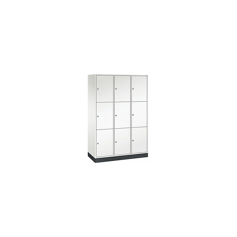 Armadietto a scomparti in acciaio INTRO, altezza scomparto 580 mm, largh. x prof. 1220 x 500 mm, 9 scomparti, corpo bianco puro, ante bianco puro. Fornitura = montato. Altezza = 1950 mm. Profondità = 500 mm. Larghezza = 1220 mm. Colore corpo = bianco puro RAL 9010. Colore porta = bianco puro RAL 9010. Serratura = serratura a cilindro differenziata. Numero scomparti in larghezza = 3 pz. Numero scomparti = 9 pz. Larghezza scomparti = 400 mm. Materiale = lamiera d'acciaio. Altezza armadietto = 1950 mm. Dotazione interna = senza dotazione interna. Larghezza interna = 360 mm. Altezza interna = 580 mm. Profondità interna = 460 mm. Tipo di porta = anta a battente. Numero chiavi = 2 pz. Altezza scomparti = 580 mm. Larghezza ripiani = 400 mm. Profondità ripiani = 500 mm. Altezza zoccolo = 100 mm. Struttura = con saldatura. Superficie = verniciatura. Struttura in acciaio di lunga durata. Serratura a cilindro con 2 chiavi. Fori di aerazione sulla parete posteriore e distanziali da 20 mm. Angolo