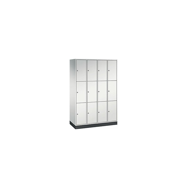 Armadietto a scomparti in acciaio INTRO, altezza scomparto 580 mm, largh. x prof. 1220 x 500 mm, 12 scomparti, corpo grigio chiaro, ante grigio chiaro. Fornitura = montato. Altezza = 1950 mm. Profondità = 500 mm. Larghezza = 1220 mm. Colore corpo = grigio chiaro RAL 7035. Colore porta = grigio chiaro RAL 7035. Serratura = serratura a cilindro differenziata. Numero scomparti in larghezza = 4 pz. Numero scomparti = 12 pz. Larghezza scomparti = 300 mm. Materiale = lamiera d'acciaio. Altezza armadietto = 1950 mm. Dotazione interna = senza dotazione interna. Larghezza interna = 260 mm. Altezza interna = 580 mm. Profondità interna = 460 mm. Tipo di porta = anta a battente. Numero chiavi = 2 pz. Altezza scomparti = 580 mm. Larghezza ripiani = 300 mm. Profondità ripiani = 500 mm. Altezza zoccolo = 100 mm. Struttura = con saldatura. Superficie = verniciatura. Struttura in acciaio di lunga durata. Serratura a cilindro con 2 chiavi. Fori di aerazione sulla parete posteriore e distanziali da 20