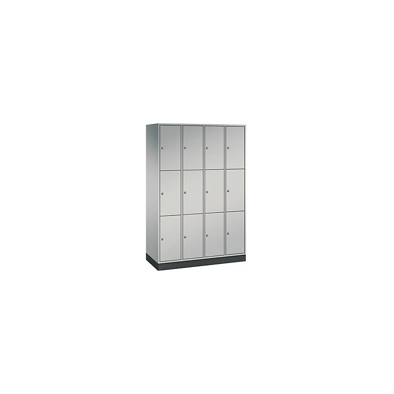 Armadietto a scomparti in acciaio INTRO, altezza scomparto 580 mm, largh. x prof. 1220 x 500 mm, 12 scomparti, corpo alluminio brillante, ante alluminio brillante. Fornitura = montato. Altezza = 1950 mm. Profondità = 500 mm. Larghezza = 1220 mm. Colore corpo = alluminio brillante RAL 9006. Colore porta = alluminio brillante RAL 9006. Serratura = serratura a cilindro differenziata. Numero scomparti in larghezza = 4 pz. Numero scomparti = 12 pz. Larghezza scomparti = 300 mm. Materiale = lamiera d'acciaio. Altezza armadietto = 1950 mm. Dotazione interna = senza dotazione interna. Larghezza interna = 260 mm. Altezza interna = 580 mm. Profondità interna = 460 mm. Tipo di porta = anta a battente. Numero chiavi = 2 pz. Altezza scomparti = 580 mm. Larghezza ripiani = 300 mm. Profondità ripiani = 500 mm. Altezza zoccolo = 100 mm. Struttura = con saldatura. Superficie = verniciatura. Struttura in acciaio di lunga durata. Serratura a cilindro con 2 chiavi. Fori di aerazione sulla parete