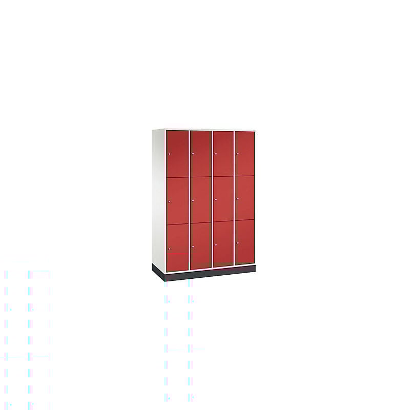 Armadietto a scomparti in acciaio INTRO, altezza scomparto 580 mm, largh. x prof. 1220 x 500 mm, 12 scomparti, corpo bianco puro, ante rosso fuoco. Fornitura = montato. Altezza = 1950 mm. Profondità = 500 mm. Larghezza = 1220 mm. Colore corpo = bianco puro RAL 9010. Colore porta = rosso fuoco RAL 3000. Serratura = serratura a cilindro differenziata. Numero scomparti in larghezza = 4 pz. Numero scomparti = 12 pz. Larghezza scomparti = 300 mm. Materiale = lamiera d'acciaio. Altezza armadietto = 1950 mm. Dotazione interna = senza dotazione interna. Larghezza interna = 260 mm. Altezza interna = 580 mm. Profondità interna = 460 mm. Tipo di porta = anta a battente. Numero chiavi = 2 pz. Altezza scomparti = 580 mm. Larghezza ripiani = 300 mm. Profondità ripiani = 500 mm. Altezza zoccolo = 100 mm. Struttura = con saldatura. Superficie = verniciatura. Struttura in acciaio di lunga durata. Serratura a cilindro con 2 chiavi. Fori di aerazione sulla parete posteriore e distanziali da 20 mm. Angolo