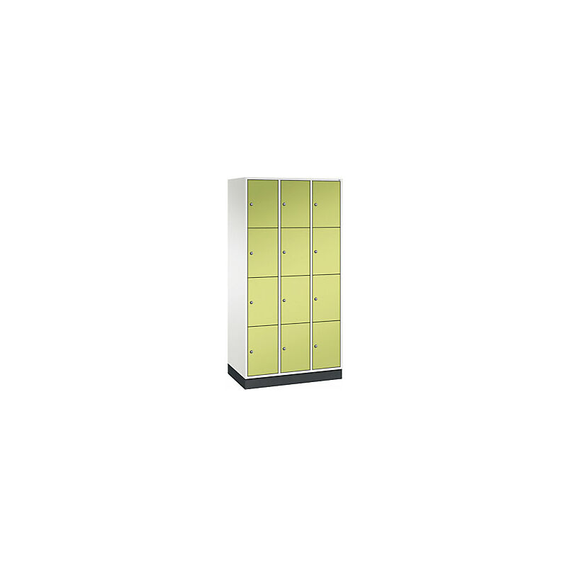 Armadietto a scomparti in acciaio INTRO, altezza scomparto 435 mm, largh. x prof. 920 x 500 mm, 12 scomparti, corpo bianco puro, ante verdino. Fornitura = montato. Altezza = 1950 mm. Profondità = 500 mm. Larghezza = 920 mm. Colore corpo = bianco puro RAL 9010. Colore porta = verde azzurrognolo RDS 1108060. Serratura = serratura a cilindro differenziata. Numero scomparti in larghezza = 3 pz. Numero scomparti = 12 pz. Larghezza scomparti = 300 mm. Materiale = lamiera d'acciaio. Altezza armadietto = 1950 mm. Dotazione interna = senza dotazione interna. Larghezza interna = 260 mm. Altezza interna = 435 mm. Profondità interna = 460 mm. Tipo di porta = anta a battente. Numero chiavi = 2 pz. Altezza scomparti = 435 mm. Larghezza ripiani = 300 mm. Profondità ripiani = 500 mm. Altezza zoccolo = 100 mm. Struttura = con saldatura. Superficie = verniciatura. Ante a parete doppia per maggiore stabilità. Struttura in acciaio di lunga durata. Serratura a cilindro con 2 chiavi. Fori di aerazione sulla