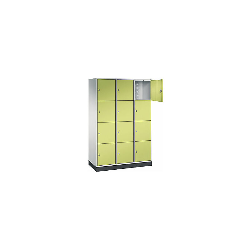 Armadietto a scomparti in acciaio INTRO, altezza scomparto 435 mm, largh. x prof. 1220 x 500 mm, 12 scomparti, corpo grigio chiaro, ante verdino. Fornitura = montato. Altezza = 1950 mm. Profondità = 500 mm. Larghezza = 1220 mm. Colore corpo = grigio chiaro RAL 7035. Colore porta = verde azzurrognolo RDS 1108060. Serratura = serratura a cilindro differenziata. Numero scomparti in larghezza = 3 pz. Numero scomparti = 12 pz. Larghezza scomparti = 400 mm. Materiale = lamiera d'acciaio. Altezza armadietto = 1950 mm. Dotazione interna = senza dotazione interna. Larghezza interna = 360 mm. Altezza interna = 435 mm. Profondità interna = 460 mm. Tipo di porta = anta a battente. Numero chiavi = 2 pz. Altezza scomparti = 435 mm. Larghezza ripiani = 400 mm. Profondità ripiani = 500 mm. Altezza zoccolo = 100 mm. Struttura = con saldatura. Superficie = verniciatura. Struttura in acciaio di lunga durata. Serratura a cilindro con 2 chiavi. Fori di aerazione sulla parete posteriore e distanziali da 20