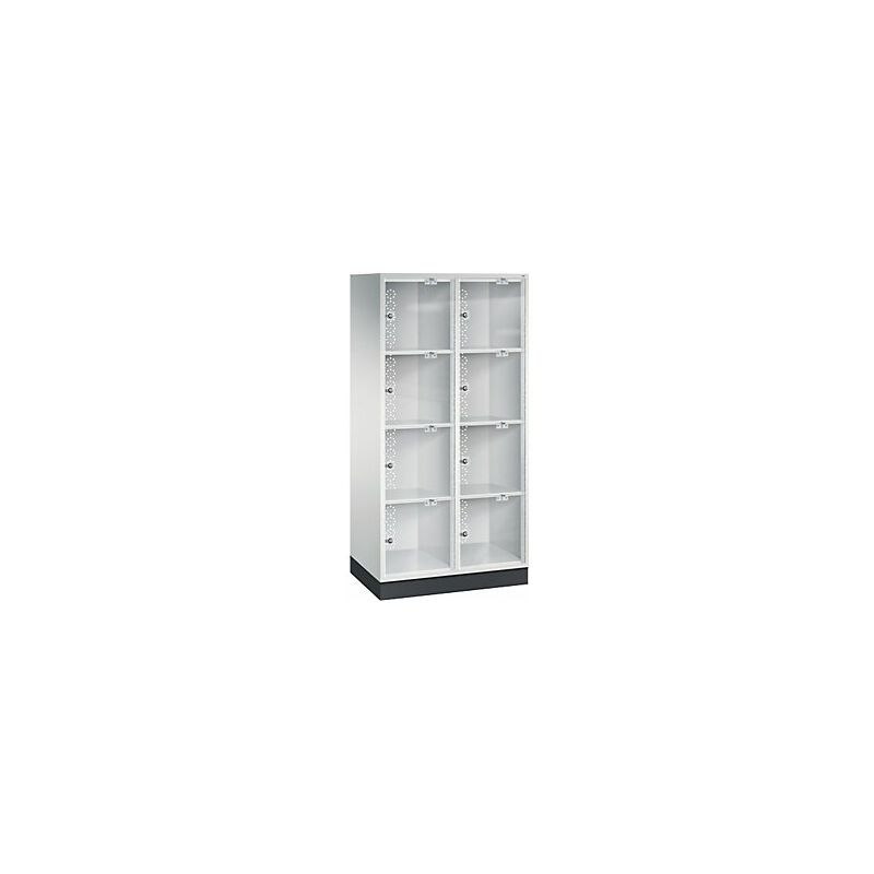 Armadietto a scomparti in acciaio INTRO con anta in vetro acrilico, alt. x largh. x prof. 1750 x 820 x 500 mm, altezza scomparto 380 mm, 8 scomparti, corpo grigio chiaro. Fornitura = montato. Altezza = 1750 mm. Profondità = 500 mm. Larghezza = 820 mm. Colore corpo = grigio chiaro RAL 7035. Colore porta = trasparente. Serratura = serratura a cilindro differenziata. Numero scomparti in larghezza = 2 pz. Numero scomparti = 8 pz. Larghezza scomparti = 400 mm. Materiale = lamiera d'acciaio. Altezza armadietto = 1750 mm. Dotazione interna = senza dotazione interna. Larghezza interna = 360 mm. Altezza interna = 380 mm. Profondità interna = 460 mm. Tipo di porta = anta a battente. Numero chiavi = 2 pz. Altezza scomparti = 380 mm. Larghezza ripiani = 400 mm. Profondità ripiani = 500 mm. Altezza zoccolo = 100 mm. Struttura = con saldatura. Superficie = verniciatura. Struttura in acciaio di lunga durata. Serratura a cilindro con 2 chiavi. Fori di aerazione sulla parete posteriore e distanziali da