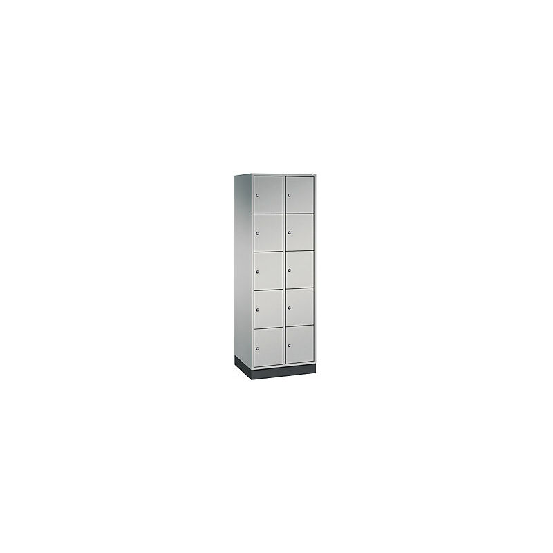 Armadietto a scomparti in acciaio INTRO, altezza scomparto 345 mm, largh. x prof. 620 x 500 mm, 10 scomparti, corpo alluminio brillante, ante alluminio brillante. Fornitura = montato. Altezza = 1950 mm. Profondità = 500 mm. Larghezza = 620 mm. Colore corpo = alluminio brillante RAL 9006. Colore porta = alluminio brillante RAL 9006. Serratura = serratura a cilindro differenziata. Numero scomparti in larghezza = 2 pz. Numero scomparti = 10 pz. Larghezza scomparti = 300 mm. Materiale = lamiera d'acciaio. Altezza armadietto = 1950 mm. Dotazione interna = senza dotazione interna. Larghezza interna = 260 mm. Altezza interna = 345 mm. Profondità interna = 460 mm. Tipo di porta = anta a battente. Numero chiavi = 2 pz. Altezza scomparti = 345 mm. Larghezza ripiani = 300 mm. Profondità ripiani = 500 mm. Altezza zoccolo = 100 mm. Struttura = con saldatura. Superficie = con verniciatura a forno. Ante a parete doppia per maggiore stabilità. Struttura in acciaio di lunga durata. Serratura a cilindro