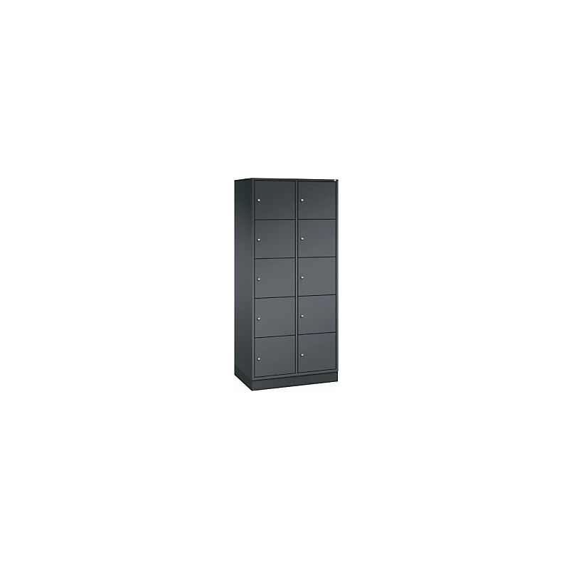 Armadietto a scomparti in acciaio INTRO, altezza scomparto 345 mm, largh. x prof. 820 x 500 mm, 10 scomparti, corpo grigio nerastro, ante grigio nerastro. Fornitura = montato. Altezza = 1950 mm. Profondità = 500 mm. Larghezza = 820 mm. Colore corpo = grigio nerastro RAL 7021. Colore porta = grigio nerastro RAL 7021. Serratura = serratura a cilindro differenziata. Numero scomparti in larghezza = 2 pz. Numero scomparti = 10 pz. Larghezza scomparti = 400 mm. Materiale = lamiera d'acciaio. Altezza armadietto = 1950 mm. Dotazione interna = senza dotazione interna. Larghezza interna = 360 mm. Altezza interna = 345 mm. Profondità interna = 460 mm. Tipo di porta = anta a battente. Numero chiavi = 2 pz. Altezza scomparti = 345 mm. Larghezza ripiani = 400 mm. Profondità ripiani = 500 mm. Altezza zoccolo = 100 mm. Struttura = con saldatura. Superficie = con verniciatura a forno. Struttura in acciaio di lunga durata. Serratura a cilindro con 2 chiavi. Fori di aerazione sulla parete posteriore e