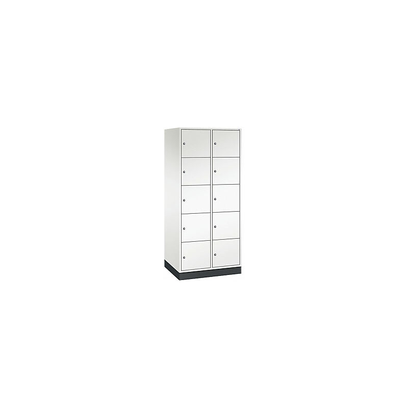 Armadietto a scomparti in acciaio INTRO, altezza scomparto 345 mm, largh. x prof. 820 x 600 mm, 10 scomparti, corpo bianco puro, ante bianco puro. Fornitura = montato. Altezza = 1950 mm. Profondità = 600 mm. Larghezza = 820 mm. Colore corpo = bianco puro RAL 9010. Colore porta = bianco puro RAL 9010. Serratura = serratura a cilindro differenziata. Numero scomparti in larghezza = 2 pz. Numero scomparti = 10 pz. Larghezza scomparti = 400 mm. Materiale = lamiera d'acciaio. Altezza armadietto = 1950 mm. Dotazione interna = senza dotazione interna. Larghezza interna = 360 mm. Altezza interna = 345 mm. Profondità interna = 560 mm. Tipo di porta = anta a battente. Numero chiavi = 2 pz. Altezza scomparti = 345 mm. Larghezza ripiani = 400 mm. Profondità ripiani = 600 mm. Altezza zoccolo = 100 mm. Struttura = con saldatura. Superficie = con verniciatura a forno. Struttura in acciaio di lunga durata. Serratura a cilindro con 2 chiavi. Fori di aerazione sulla parete posteriore e distanziali da 20