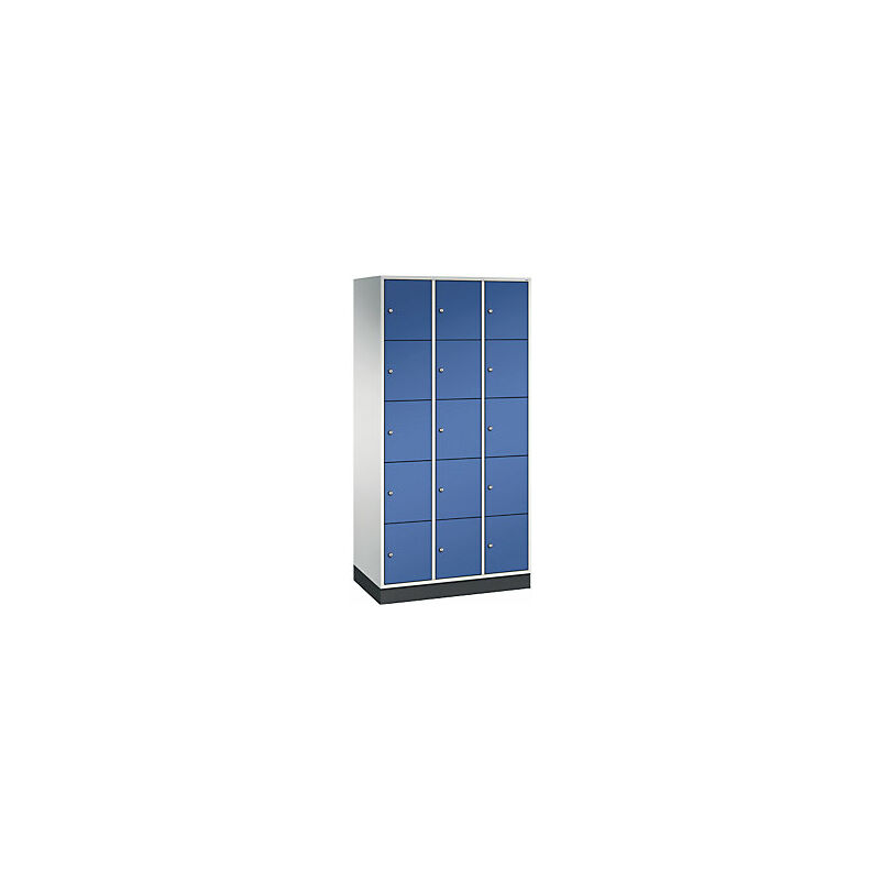 Armadietto a scomparti in acciaio INTRO, altezza scomparto 345 mm, largh. x prof. 920 x 500 mm, 15 scomparti, corpo grigio chiaro, ante blu genziana. Fornitura = montato. Altezza = 1950 mm. Profondità = 500 mm. Larghezza = 920 mm. Colore corpo = grigio chiaro RAL 7035. Colore porta = blu genziana RAL 5010. Serratura = serratura a cilindro differenziata. Numero scomparti in larghezza = 3 pz. Numero scomparti = 15 pz. Larghezza scomparti = 300 mm. Materiale = lamiera d'acciaio. Altezza armadietto = 1950 mm. Dotazione interna = senza dotazione interna. Larghezza interna = 260 mm. Altezza interna = 345 mm. Profondità interna = 460 mm. Tipo di porta = anta a battente. Numero chiavi = 2 pz. Altezza scomparti = 345 mm. Larghezza ripiani = 300 mm. Profondità ripiani = 500 mm. Altezza zoccolo = 100 mm. Struttura = con saldatura. Superficie = con verniciatura a forno. Ante a parete doppia per maggiore stabilità. Struttura in acciaio di lunga durata. Serratura a cilindro con 2 chiavi. Fori di