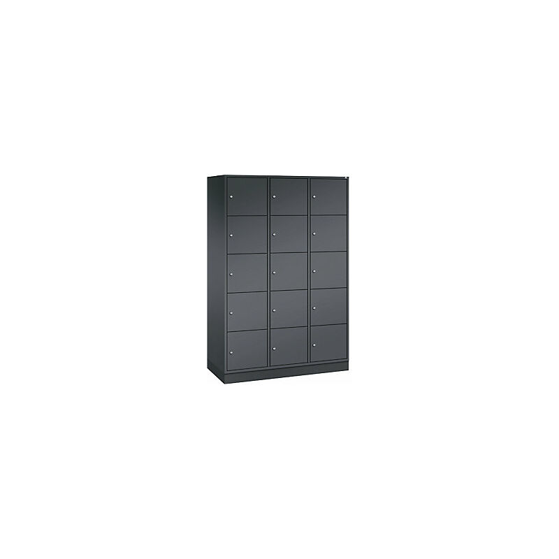Armadietto a scomparti in acciaio INTRO, altezza scomparto 345 mm, largh. x prof. 1220 x 500 mm, 15 scomparti, corpo grigio nerastro, ante grigio nerastro. Fornitura = montato. Altezza = 1950 mm. Profondità = 500 mm. Larghezza = 1220 mm. Colore corpo = grigio nerastro RAL 7021. Colore porta = grigio nerastro RAL 7021. Serratura = serratura a cilindro differenziata. Numero scomparti in larghezza = 3 pz. Numero scomparti = 15 pz. Larghezza scomparti = 300 mm. Materiale = lamiera d'acciaio. Altezza armadietto = 1950 mm. Dotazione interna = senza dotazione interna. Larghezza interna = 360 mm. Altezza interna = 345 mm. Profondità interna = 460 mm. Tipo di porta = anta a battente. Numero chiavi = 2 pz. Altezza scomparti = 345 mm. Larghezza ripiani = 360 mm. Profondità ripiani = 500 mm. Altezza zoccolo = 100 mm. Struttura = con saldatura. Superficie = con verniciatura a forno. Struttura in acciaio di lunga durata. Serratura a cilindro con 2 chiavi. Fori di aerazione sulla parete posteriore e