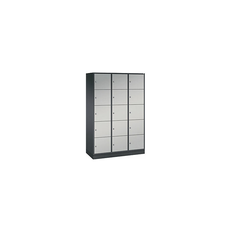 Armadietto a scomparti in acciaio INTRO, altezza scomparto 345 mm, largh. x prof. 1220 x 500 mm, 15 scomparti, corpo grigio nerastro, ante alluminio brillante. Fornitura = montato. Altezza = 1950 mm. Profondità = 500 mm. Larghezza = 1220 mm. Colore corpo = grigio nerastro RAL 7021. Colore porta = alluminio brillante RAL 9006. Serratura = serratura a cilindro differenziata. Numero scomparti in larghezza = 3 pz. Numero scomparti = 15 pz. Larghezza scomparti = 300 mm. Materiale = lamiera d'acciaio. Altezza armadietto = 1950 mm. Dotazione interna = senza dotazione interna. Larghezza interna = 360 mm. Altezza interna = 345 mm. Profondità interna = 460 mm. Tipo di porta = anta a battente. Numero chiavi = 2 pz. Altezza scomparti = 345 mm. Larghezza ripiani = 360 mm. Profondità ripiani = 500 mm. Altezza zoccolo = 100 mm. Struttura = con saldatura. Superficie = con verniciatura a forno. Struttura in acciaio di lunga durata. Serratura a cilindro con 2 chiavi. Fori di aerazione sulla parete